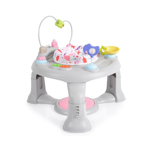 С платформа за подскачане. Седалката е удобна и се върти на 360 градуса , като по този начин улеснява достъпа на детето до играчките.
