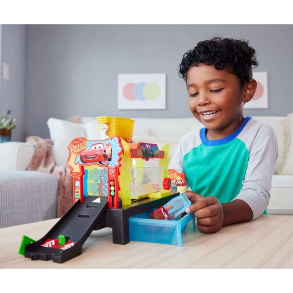 Disney и Pixar Cars Color Changers – Автомивка за състезатели! Маккуин светкавицата винаги трябва да изглежда безупречно, когато се подготвя за ново състезание! С комплекта автомивка с промяна на цвета на количките децата могат да му помогнат да заблести, преди да се впусне отново по пистата.