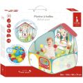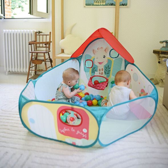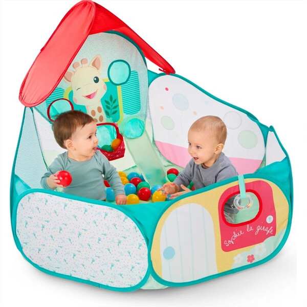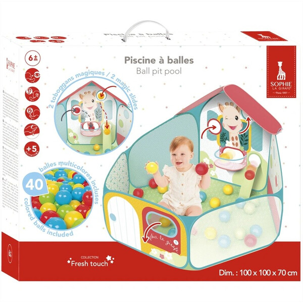 Съдържание на комплекта: басейн с pop-up конструкция под формата на къщичка с тематика Sophie la Girafe и 40 броя леки цветни топки, перфектно адаптирани към малките ръчички на бебето.