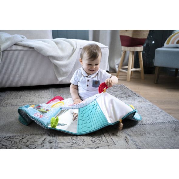 - Сетивно развитие: С текстури, които стимулират осезанието, релефни елементи, огледалца, звуци на смачкана хартия и гризалки, постелката подпомага сетивното изследване на детето, предлагайки му постоянни стимули.