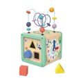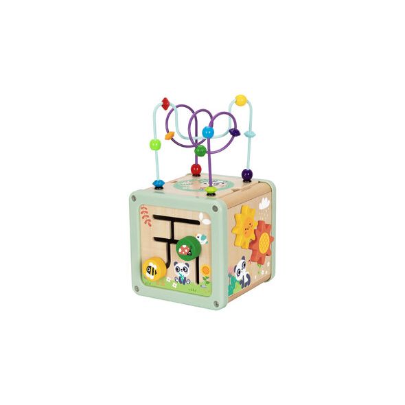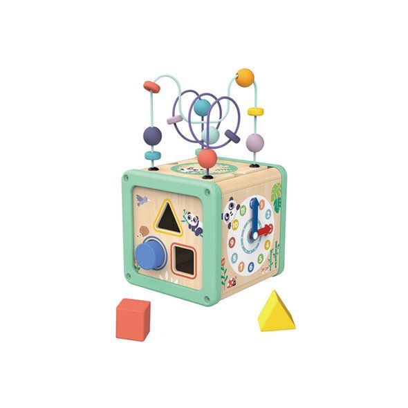 Дървен активен куб Panda предлага четири различни страни за забавление и учене. Има сортер, низанка, зъбни колела и часовник с подвижни стрелки.