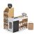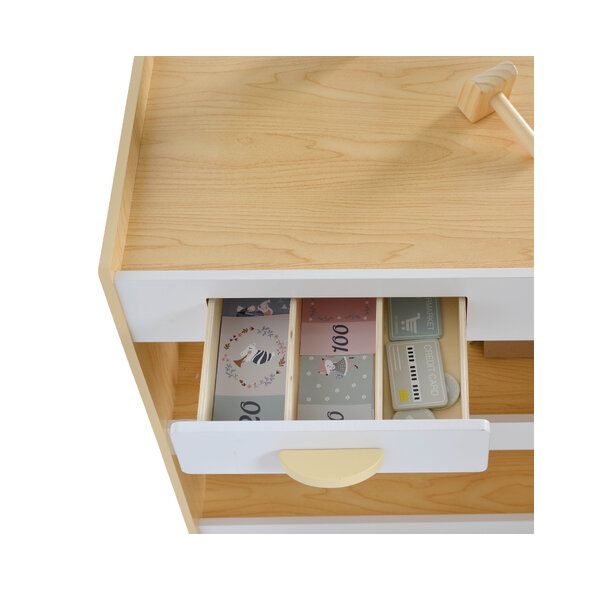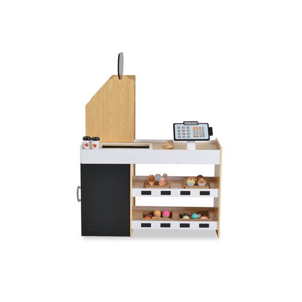 Комплектът включва:• Голям щанд с касов апарат, изваждащо се чекмедже, рафтове и заключващ се шкаф
