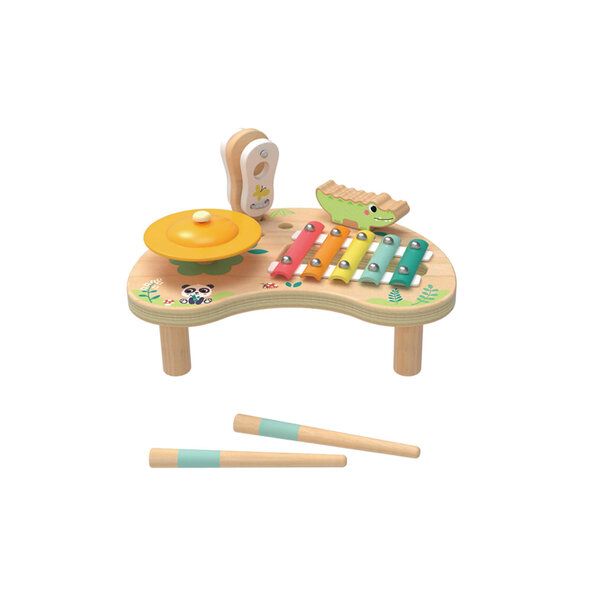 Дървен музикален център съчетава забавление и учене в един цветен дизайн. Включва ксилофон, чинел и звукови елементи, които стимулират слуха, ритъма и креативността на детето.