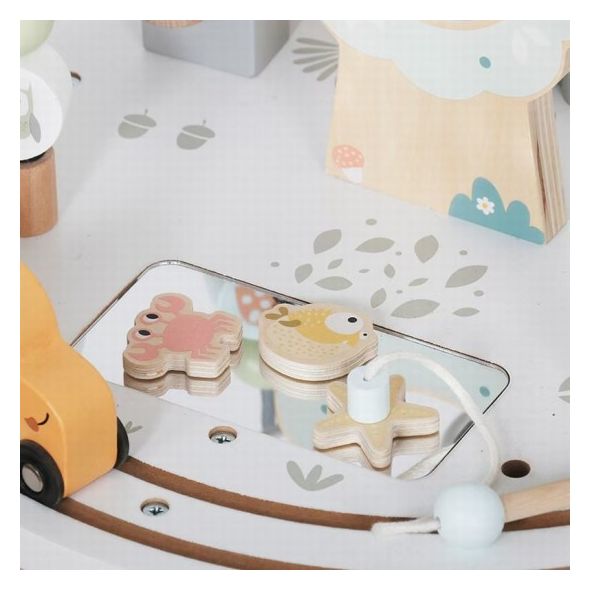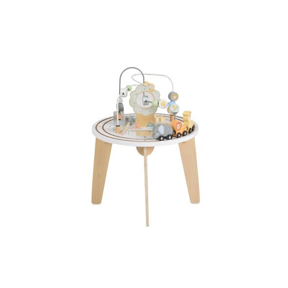 Вдъхновете любопитството и уменията на вашето дете с тази дървена активна маса с различни сектори за игра от Moni Toys! Играчката включва релси с дървен влак, състоящ се от животни – слон, жираф и лъв, лабиринт с мъниста и различни въртящи се елементи, които правят играта разнообразна и забавна.