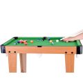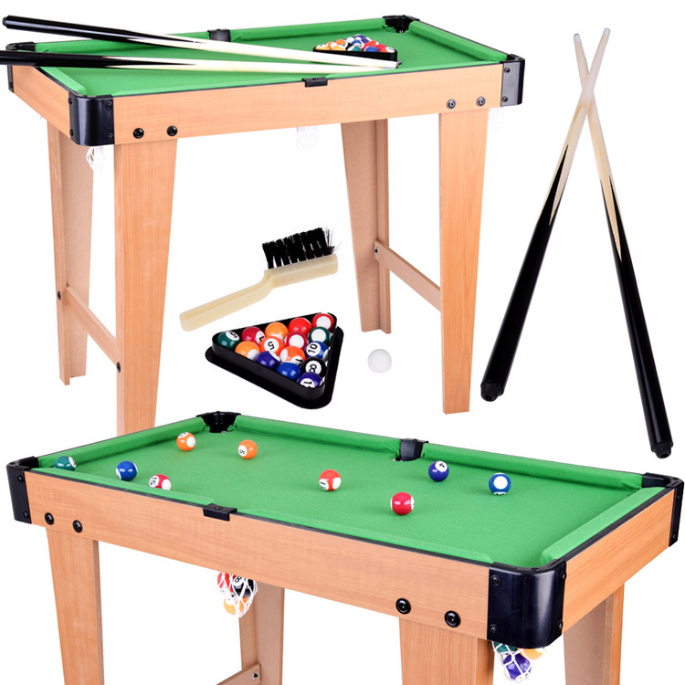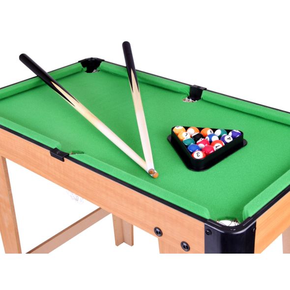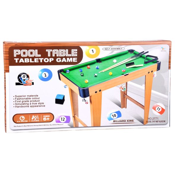 Комплектът включва всичко необходимо, за да започне играта веднага – два билярдни щека, пълен комплект топки, триъгълник за подреждане, четка за почистване и билярдна креда. Това прави играта още по-реалистична и интересна за децата.