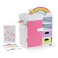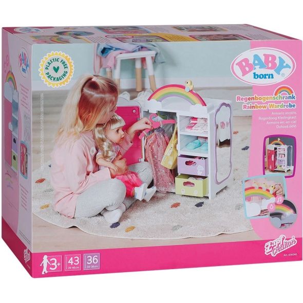 Гардероб за кукла Baby Born Дъга 790191 Преместването е наистина забавно с гардероба BABY born Rainbow! Докато патицата Берта е бутната над дъгата, тя светва. Берта свири весела мелодия, която я зарежда с добро настроение, докато избира днешното си облекло. Благодарение на релсата за дрехи, рафтовете и подвижните чекмеджета има достатъчно място за дрехите на куклата. Чанти или подобни предмети могат да бъдат окачени на сладките закачалки облаци от външната страна на гардероба. BABY born може да се любува на тоалета си в огледалото в цял ръст. Самият гардероб също може да стане още по-цветен с листа със стикери.