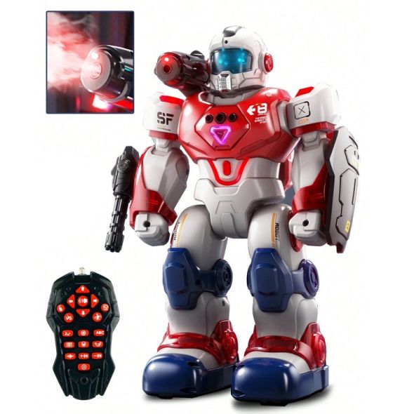 Многофункционален радиоуправляем робот, който говори, програмира се, танцува, изкарва пара и има светлинни ефекти. Височина 33 см, обхват 10 м, USB зареждане.