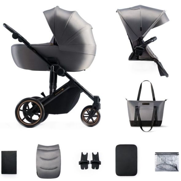Комплектът включва: кош за новородено с матрак, седалка за по-големи деца, чанта с подложка за смяна на пелени, дъждобран, мрежа против комари, покривало за крачета и универсални адаптери за автомобилни столчета.