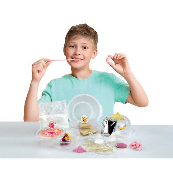 Направи си сам до 60 дъвки - сладки или кисели! Развихрете въображението си: създайте своя собствена дъвка с помощта на науката! Разтеглете и отрежете вашата дъвка! Направете я с два вкуса - банан или дъвка! Сладко удоволствие или кисел оттенък? Смесете ги по свой начин!