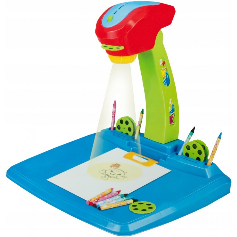 Достатъчно е малчуганът да постави диск с изображение, да включи проектора и избраният модел ще се проектира върху повърхността за рисуване. Детето може лесно да прекопира картинката, да я оцветява и да създава свои собствени творби с включените моливи и шаблони.