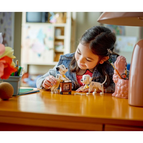 - Малки далматинци навсякъде – тази детска играчка за построяване включва героите Лъки и Пени на LEGO® ǀ Disney от класическия филм „101 далматинци“, плюс кокал от тухлички и малък телевизор с екран;