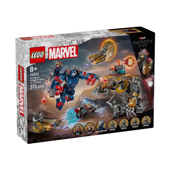 LEGO® ǀ Marvel Отмъстителите: Краят Тор срещу Читаури(76322) е първокласна супергеройска играчка за конструиране за деца на възраст над 8 години. Този универсален подарък за фенове на Marvel е идеален за любителите на играчки за конструиране и игра, екшън герои и филма Отмъстителите: Краят на Marvel Studios. Базиран на емблематична бойна сцена от филма за Отмъстителите на Marvel, този комплект със супергерой включва две големи фигури LEGO: роботът Железен патриот с 4 оръдия и страховитата горила на Читаури. И двете са подвижни за динамична игра. Има 7 минифигури: Железен патриот MK2; Ракета с голямо оръдия; Тор с Буреносец и четирима воини Читаури, двама от които със златни стрелци. Други елементи включват 2 реактивни скутера и малка сцена за Тор, където могат да се съхраняват амуниции за оръдия. Този комплект за построяване и игра се свързва с Отмъстителите: Краят Последната битка (76323) за още повече игра. Строителите могат също така да мащабират и завъртат модели в 3D с помощта на забавното интуитивно приложение LEGO Builder. Комплектът съдържа 373 части.