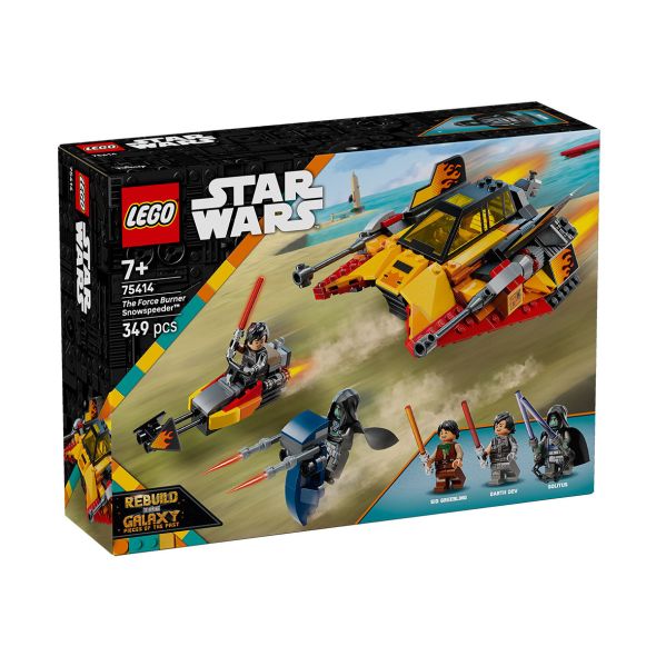 Подгответе се за скоростна екшън игра със „Снежен спидер „Изгаряща сила“ (75414). Страхотна идея за подарък Star Wars™ подарък за момчета, момичета и фенове на възраст над 7 години, тази колекционерска строителна играчка за деца пресъздава автентични елементи на уникалното превозно средство, както може да се види в сезон 2 на LEGO® Star Wars: Rebuild the Galaxy™. Има впечатляваща украса с пламъци, отваряща се двойна кабина със скрит подвижен скоростен мотоциклет и задно оръдие. Натиснете надолу седалката в задната част на кабината (или главата на минифигурата LEGO, седнала в нея), за да освободите мотоциклета. Този строителен комплект включва и първите по рода си минифигури LEGO Star Wars на Sig Greebling, Дарт Дев и Солитус. Всеки геройима светлинен меч, включително двойния светлинен меч на Solitus с верига, а освен това Солитус има и страхотен STAP за бойна игра. Комплектът съдържа 349 части.