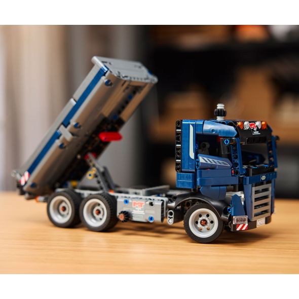 Поддържайте нещата в движение на строителната площадка с този самосвал LEGO® Technic! Позиционирайте камиона. Завъртете копчето отстрани на камиона, за да наклоните каросерията. Отворете вратите, за да погледнете вътре в кабината, след което закарайте неуморния камион до следващата му задача на строителната площадка.