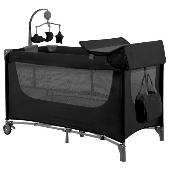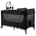 Кошарата разполага с мрежести панели от всички страни, които осигуряват отлична вентилация и позволяват на родителите да наблюдават детето по всяко време. Предният и страничният панел са оборудвани с ципове за лесен достъп до бебето. Отстраняемата масичка за преповиване е практично допълнение, което превръща кошарата в многофункционално решение за ежедневните грижи. Музикалният гриф с играчки ще забавлява и стимулира сетивата на малчугана.