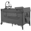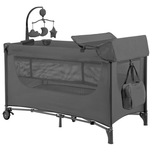 Кошарата разполага с мрежести панели от всички страни, които осигуряват отлична вентилация и позволяват на родителите да наблюдават детето по всяко време. Предният и страничният панел са оборудвани с ципове за лесен достъп до бебето. Отстраняемата масичка за преповиване е практично допълнение, което превръща кошарата в многофункционално решение за ежедневните грижи. Музикалният гриф с играчки ще забавлява и стимулира сетивата на малчугана.