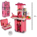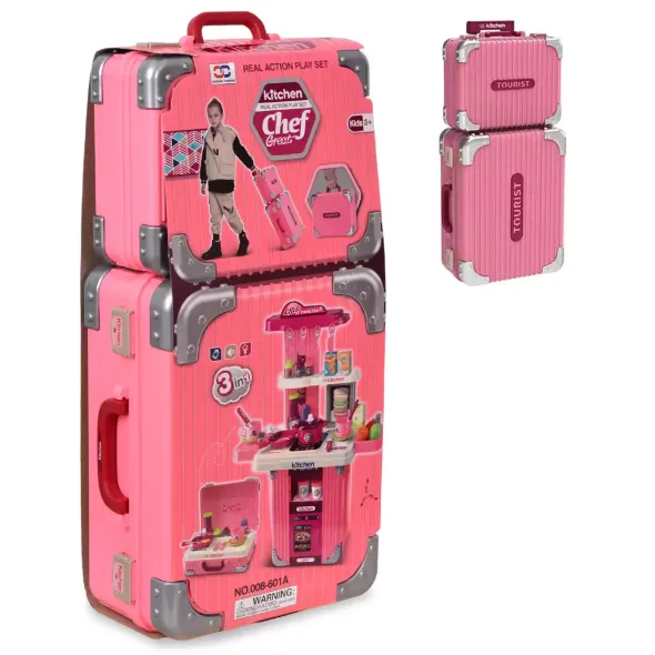 Детски комплект кухня с два куфара е перфектният помощник за всеки малък готвач! Комплектът включва голям куфар (24х14х32 см) и малък куфар (24х20х10 см), изработени от висококачествен и безопасен за деца пластмаса. Яркият син дизайн с бели и тъмносини акценти прави играчката изключително привлекателна и модерна.