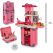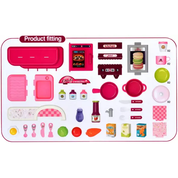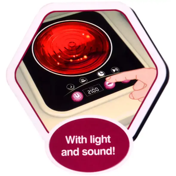 Комплектът предлага всичко, от което едно дете се нуждае за часове ролеви игри: печка със светещи индикатори и реалистични звуци, тенджера и тиган с капаци, прибори, чашки, чинийки, половници, чаши за кафе, както и разнообразие от забавни имитации на храни – кутии с чипс, зеленчуци, кетчуп, сол, бурканчета за подправки, яйца и дори яичница. В долната част е разположена и малка „фурна“, която прави играта още по-реалистична.