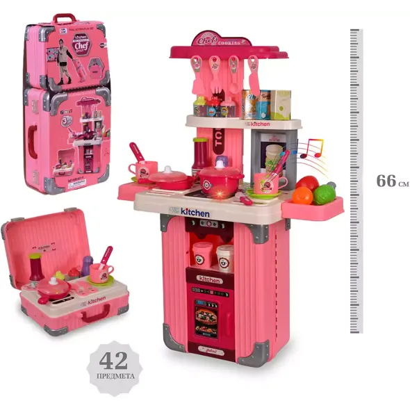 Истинската магия се крие вътре – цяла кулинарна вселена от 42 аксесоара! Кухнята се сглобява бързо и лесно без инструменти, превръщайки процеса в забавление само по себе си. Готовата кухня достига размери 66х48х24 см, което позволява удобно разполагане във всяка детска стая или дори до мама в кухнята.