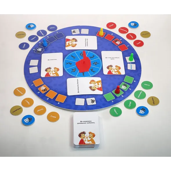 - 28 броя жетони (16 жетона с мнения, 8 жетона за задания, 4 златни жетона „Прецакан“);