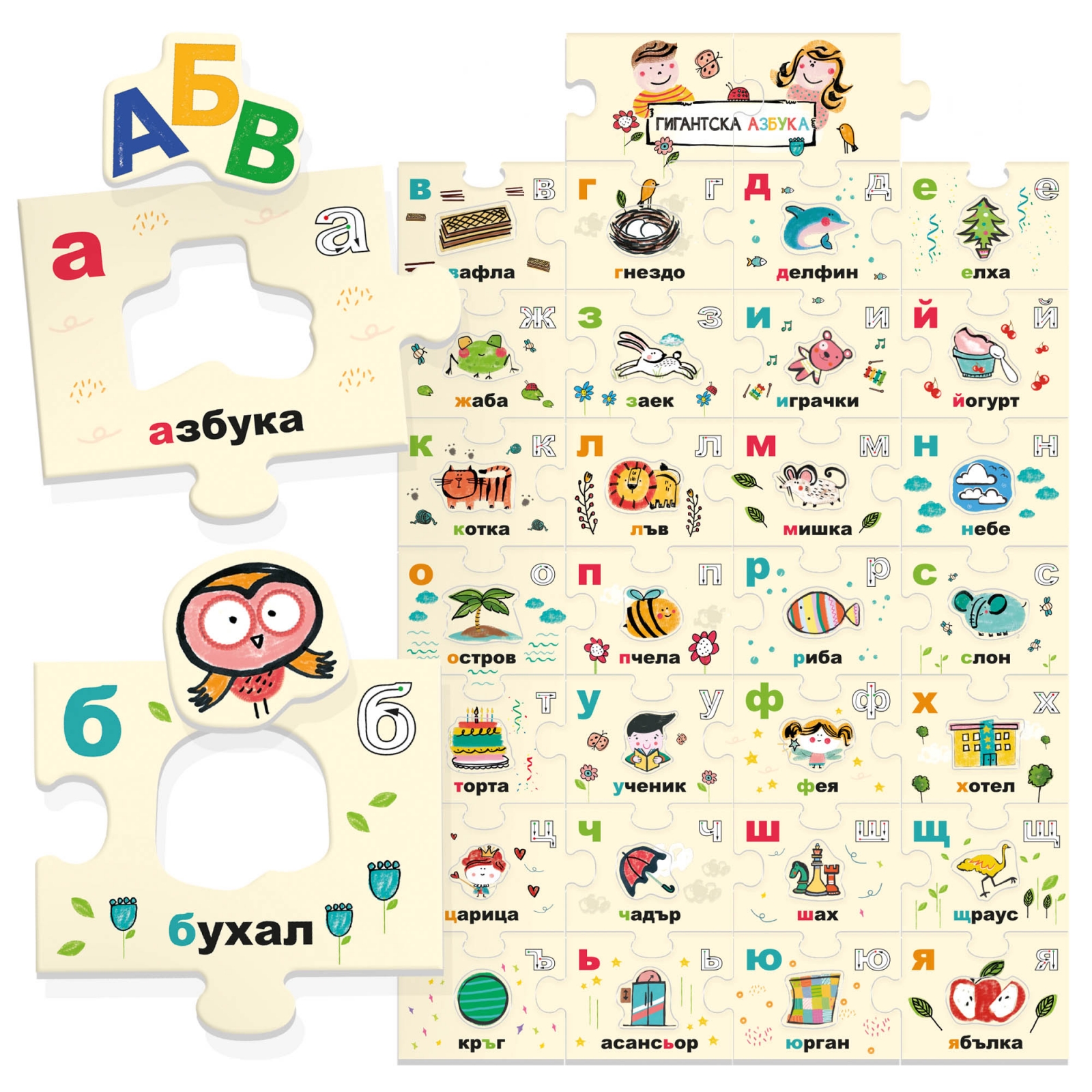 Съдържание: 30 части гигантски пъзели ; 26 оформящи табла. С помощта на гигантската азбука децата развиват речниковия си запас, научават се на азбуката и подпомага развитието на финната моторика.