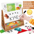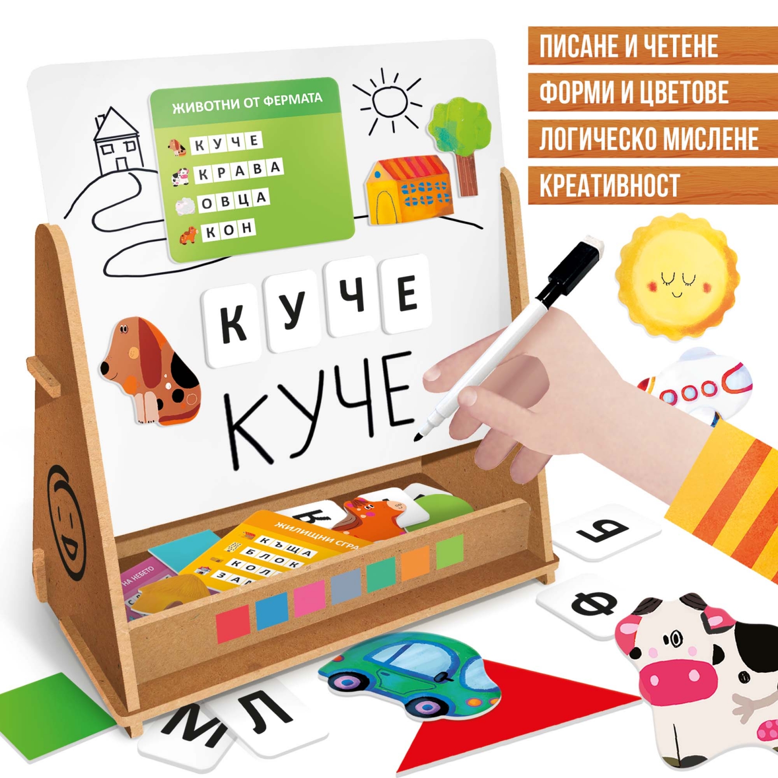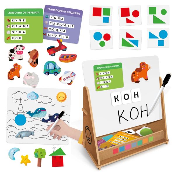 Богат комплект образователни материали и 100 магнита, с които ще се научиш на много нови думи, форми и цветове. С помощта на специалната магнитна дървена дъска можеш да се научиш да пишеш и четеш по оригинален и забавен начин, докато играеш!