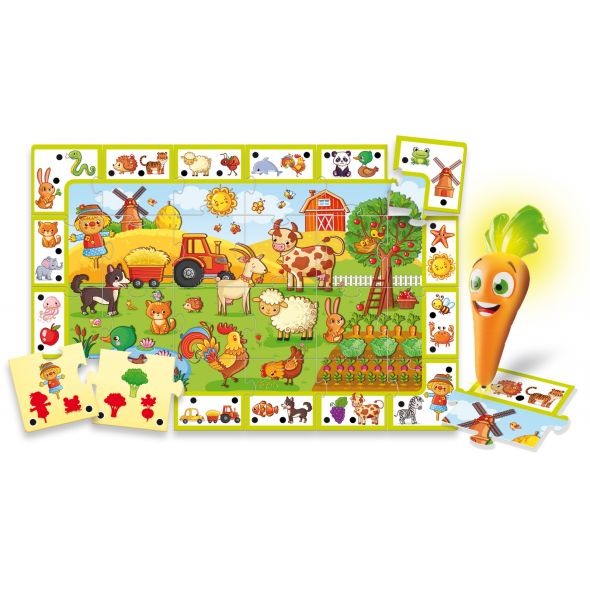Каротина обича природата и обича да е на село! Тя ще ти помогне да научиш много думи, свързани с фермата, чрез лесни и забавни въпроси. За да отговаряш, използвай говорещата химикалка Каротина. Освен това можеш да играеш на „Намери и открий“, като търсиш елементите от рамката в основното изображение. А на гърба на пъзела ще откриеш много гатанки.