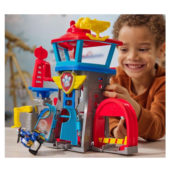 Създайте вълнуващи спасителни мисии с Adventure Bay въздушна спасителна операция! Комплектът е висок над 30 см и разполага с повече от 7 зони за игра, както и с автомобил Chase Pup Squad Racer от серията Air Rescue. Когато настъпи време за действие, отидете до командния център и проверете монитора за мисии! Humdinger отново е в беда и е заседнал на радарната кула! Но няма проблем - Чейс поема случая! Закрепете количката към въртящото се рамо за полет и я завъртете, за да спасите Humdinger навреме. След успешната мисия можете да спрете на автомивката, да посетите станцията за зареждане с гориво и след това да използвате стартера за превозни средства за нова високоскоростна спасителна мисия. Играчките PAW Patrol за малки деца насърчават въображаемата ролева игра и подпомагат развитието на фината моторика. Пресъздайте любими моменти от сезоните на PAW Patrol, като Mighty Pups или PAW Patrol: The Movie, и създавайте нови приключения с кученцата и техните превозни средства (продават се отделно). Разширете забавлението с пълната серия Action Pups и Air Rescue, включваща превозни средства, фигурки и комплекти за игра за безкрайни приключения.