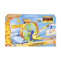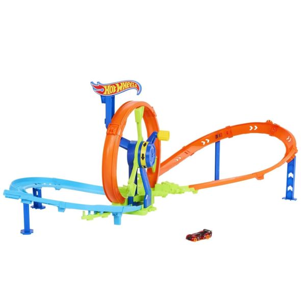 Завъртете иновативния механизъм на колелото и пуснете Hot Wheels коли, за да ги накарате да извършват каскади, състезават се и се разбиват в този див комплект за игра. Пуснете включената метална кола в мащаб 1:64 върху пистата и автоматичното повдигане я изпраща през обръщалото, през завой, през зона за сблъсък и след това обратно към старта, за да го направи отново. Увеличете вълнението, като добавите още коли за неизбежния сблъсък. Допълнителни коли се продават поотделно. Комплектът се сгъва и има дръжка за лесно пренасяне и съхранение. Цветове и декорации могат да варират.