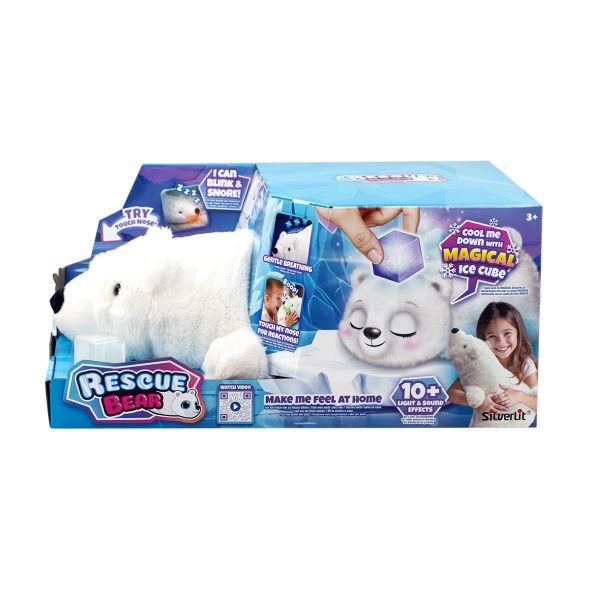 Полярното мече за спасяване се чувства твърде топло – нека го охладим и да го накараме да се чувства като у дома си! Полярното мече за спасяване има меко плюшено тяло, идеално за прегръдки. Потупай го по гърба и то ще издаде смешни звуци със светлинни ефекти! Погали го няколко пъти, за да го приспиш, и то ще започне да похърква с нежни нагоре-надолу движения имитиращи дошане. Събуди Полярното мече за спасяване, като докоснеш носа му, и той ще отвори очи, които ще премигнат! Ако го държиш твърде силно и прекалено дълго, ще започне да му става горещо и неудобно. Тогава можеш да използваш магическото ледено кубче – постави го на главата на мечето, за да го охладиш със светлинни и звукови ефекти. От теб зависи да накараш Полярното мече за спасяване да се чувства в безопасност у дома! Препоръчителна възраст: 5+ години.