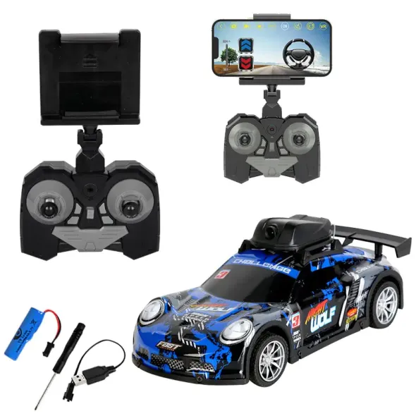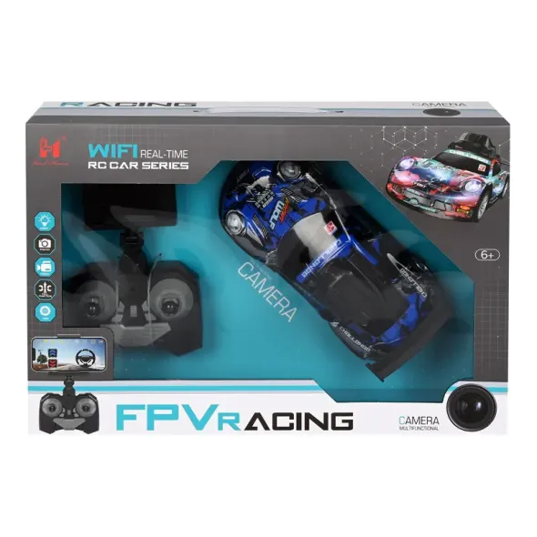 Тази състезателна кола с камера, светлинни ефекти и РК предлага  заснемане на видео и снимки в реално време чрез камера,  управлявана чрез приложение на вашия телефон - сканирайте QR кода от кутията и свалете приложението.
