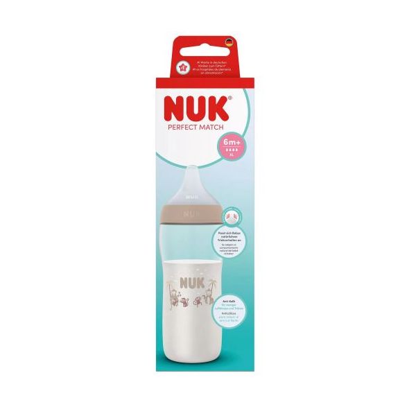Шишенцето NUK Perfect Match е с нежен дизайн, леко и удобно. Разполага със силиконов биберон и интегрирана скала, която показва температурата на храната. Бутилката за пиене е непропусклива, изработена от здрав, устойчив на счупване полипропилен.