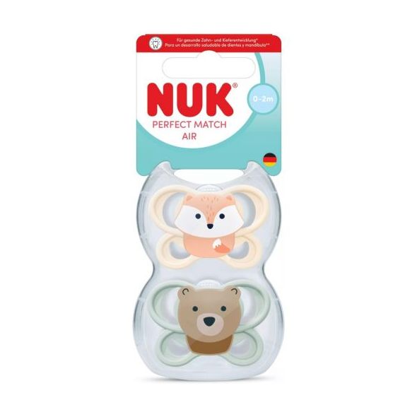 Залъгалките NUK Perfect Match Air са специално създадени за бебета с чувствителна кожа и са подходящи за мъници на възраст от 0 до 2 месеца. Комплектът включва 2 броя залъгалки с очарователна декорация.