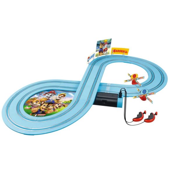 Най-малките състезатели вече могат да започнат своето ново приключение със смелите кучета Чейс и Маршал. Състезателната писта от Carrera пренася героите на Paw Patrol директно в детската стая. На 2,4-метровата писта Чейс и Маршал се състезават със своите състезателни коли през вълнуващи завои, бързи прави и трудни пасажи. Забавен въртящ се пумпал носи допълнително екшън и позволява на децата да изпитат от първа ръка какво е чувството да бъдат част от спасителната мисия. Цветните декоративни елементи от серията Paw Patrol създават автентична атмосфера и въвличат малките пилоти директно в приключението. Комплектът работи с батерии, оборудван е с удобни за деца ръчни контролери и по този начин гарантира игриво забавление.
