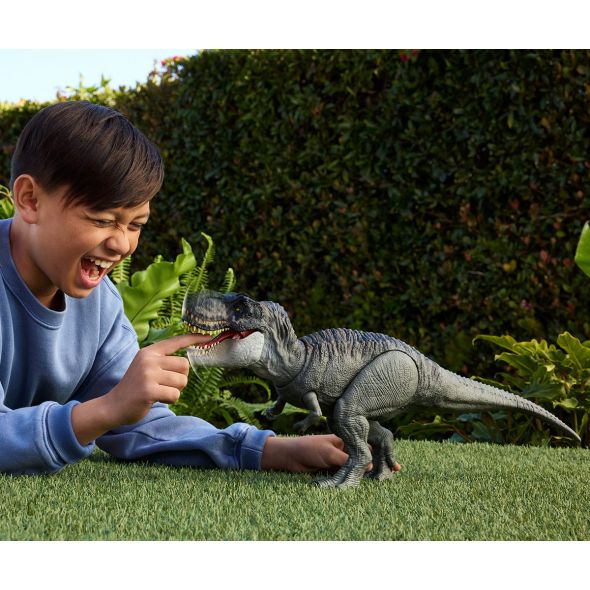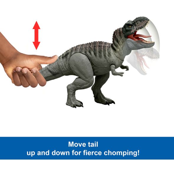 Тиранозавър Рекс, вдъхновен от Jurassic World Rebirth, идва с яростна функция за многократно захапване! При натискане на езика се чува първичен победоносен рев. Ако езикът се задържи по-дълго, се активира свирепа поредица от непрекъснати захапвания със светлинни и звукови ефекти!