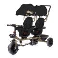 Предимствата са въртящите се на 360 градуса седалки, два сенника, две комфортни седалки, две поставки за крачета, предпазни колани, кошче за багаж, кошче за аксесоари, звънец, големи гуми. Всичко това създава перфектно удобство на вашето дете.