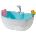 „Да, време е за къпане!“ Бебето се настанява удобно в очарователната вана и вече може да се къпе. Прицелете се, стреляйте, аааа... НАМОКРЕН СИ! Братът е наистина мокър. Патето за баня е идеално за водни битки. Можете да го поставите навсякъде по ръба на ваната, точно както и възглавницата във формата на сърце. Ваната е водносиня отвътре и бяла с вградена форма на вълна отвън. Ако натиснете превключвателя за осветлението до душа, външната обвивка на ваната светва в редуващи се цветове. Бутонът за душ активира розово-белия душ. Ако ваната е празна, можете да чуете плискане и типичните водни звуци. Ако ваната е била предварително напълнена с вода, сега водата тече през слушалката на душа, която може да се наклони към ваната, така че водата да не капе извън ваната. Можете също така да извадите маркуча, за да измиете добре BABY born или да намокрите брат си още малко.